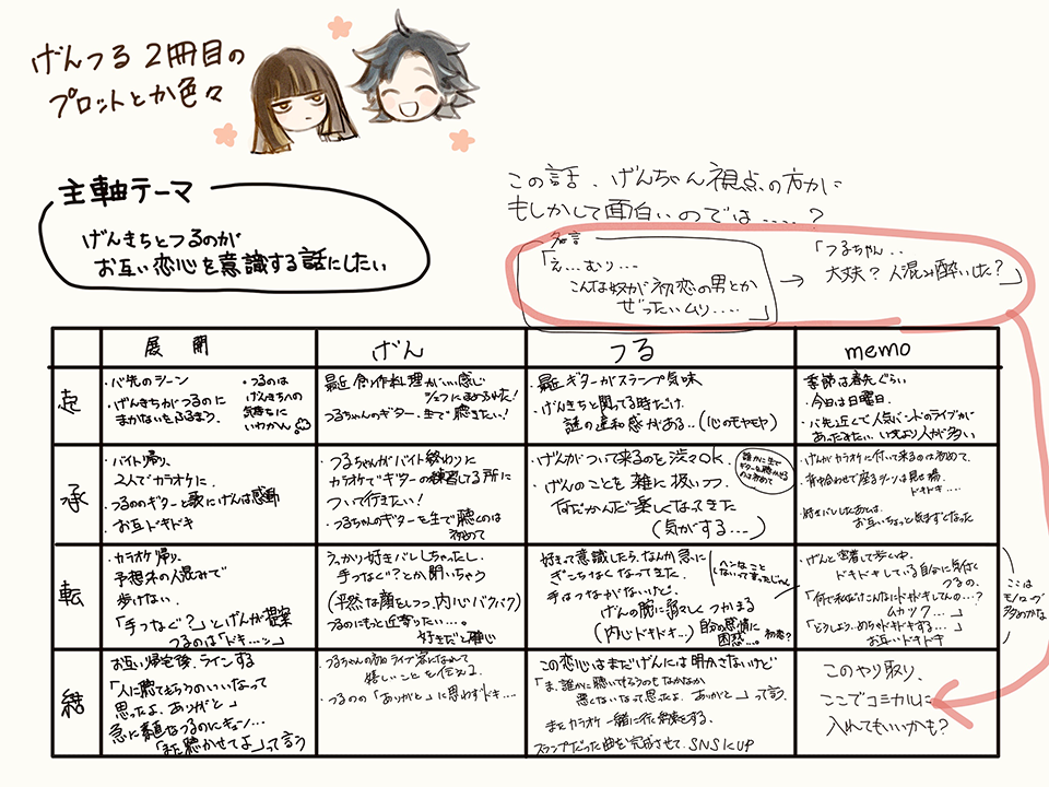 熊辛:私が好きなYouTuberさんが小説を作る際にこうしている、とおっしゃっているのを見て、真似させていただきました。ただこうしてきちんと整理整頓すると、私の場合はちょっと頭が固くなってしまうというか……私には合ってないのかも?と思いました。それで結局また何もない真っ白の画面に手でメモを書いていく、自由度の高い形式に戻りました。でも一度この表の形式でやってみたことで、起承転結をきちんと考えなきゃいけないんだなとわかったので、やってみてよかったです。